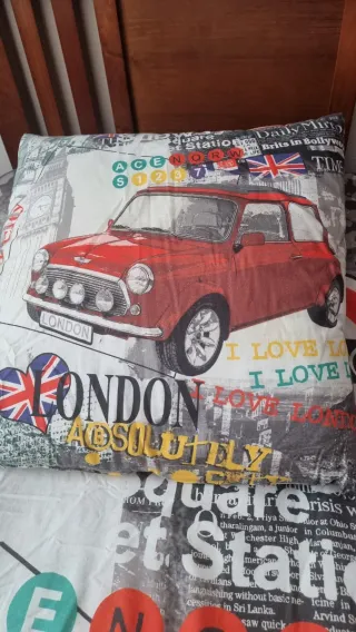 Edredón con un vibrante diseño inspirado en Londres, con un coche clásico rojo como protagonista. Para cama de 105cm,ahora puesto en cama de 90cm. Incluye cojin - Diseño de la Union Jack y el Big Ben. - Texto London y Absolutely en relieve. - Estampado de periódico con temática londinense.