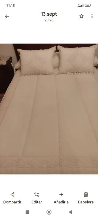 Edredón de tela en un tono blanco sucio con un diseño elegante y detalles de encaje en el borde También dos cojines a juego Medidas 1,35 x 1,90 y caída de 53 Ver fotos.