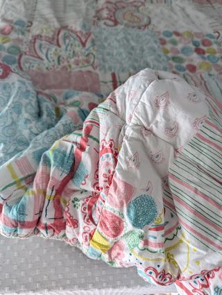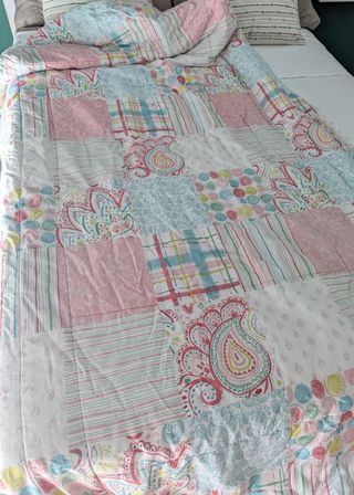 Edredón con un bonito estampado, ideal para camas de 90cm.Reversible. - Diseño patchwork con motivos florales y de rayas. - Colores alegres y suaves.
