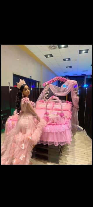 Cama para miramiento gitano en color rosa,todo menos los cojines Edredón Tul Tira de flores grandes con flores colgando Estructura de hierro en forma de arco