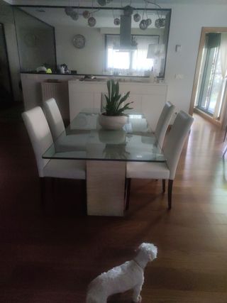 Conjunto de mesa extensible con 2 cajones y 6 sillas de madera con asientos tapizados. - Mesa con superficie blanca. Medidas 70cm de ancho y 120cm de largo con dos laterales extensibles de 30cm, haciendo así una mesa de 180cm aproximadamente. - 6 sillas de madera, 4 de ellas con respaldo curvo. - Asientos acolchados.