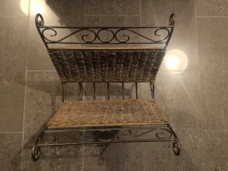 Elegante revistero artesanal con un diseño único. - Estructura metálica con detalles decorativos. - Panel central tejido en mimbre. - Patas metálicas con remates. - Plegable