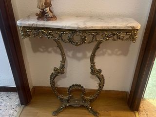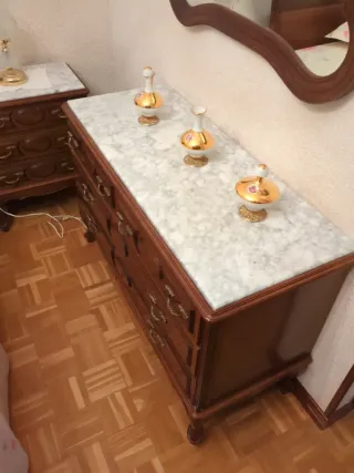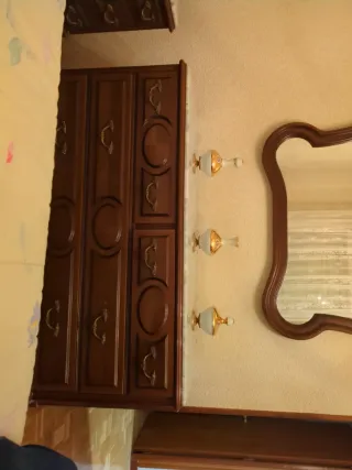Elegante tocador de madera con un diseño clásico. Incluye un espejo con marco curvo y tres apliques de luz. - Acabado en tonos marrones y dorados. - Detalles ornamentales en los cajones y puertas. - Espejo con forma ondulada.
