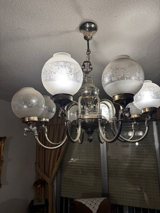 Elegante lámpara antigua con un diseño clásico. Tiene una tulipa agrietada