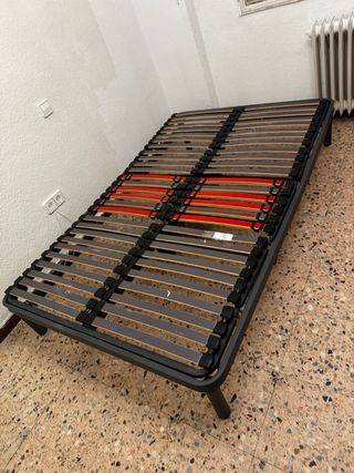 Base de cama con somier eléctrico de láminas de madera y estructura metálica. Tiene una lama rota
