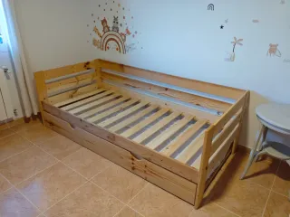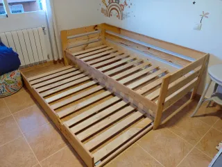 Cama nido de madera. Cama superior para colchón de 90x200 e inferior para colchón de 90x190. - Estructura robusta de madera. - Incluye cama inferior extraíble con ruedas - Sirve como diván o sofá cama.