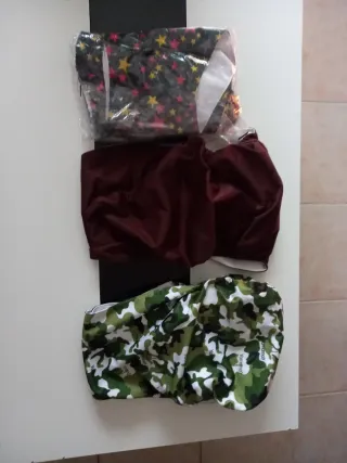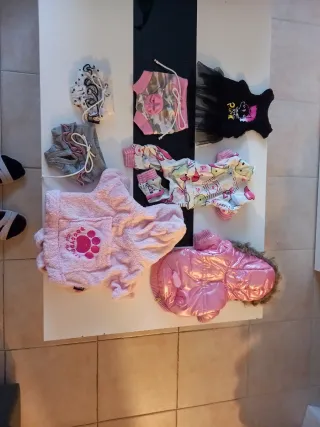 Conjunto de ropa para perrita. - Incluye varios conjuntos y prendas. - Diseños variados con detalles. - Tejidos suaves y cómodos. Abrigo, chandal, albornoz, pijama, 3 bragitas, y camiseta punki.