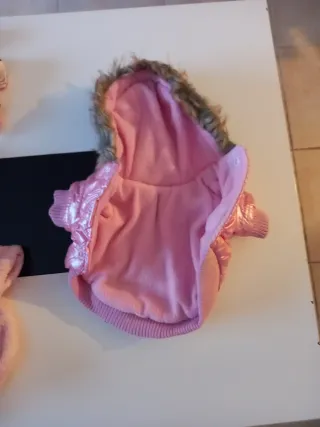 Conjunto de tres abrigos para perrita. - Abrigo rosa con capucha gris. Talla M - Abrigo rosa con estampado de estrellas y borde de pelo. Talla S - Abrigo negro con estampado de logo. Talla S