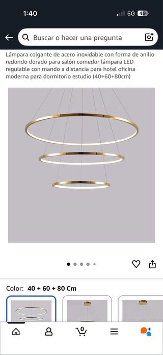 Elegante lámpara colgante con diseño de aros entrelazados. - Acabado en acero inoxidable dorado. - Incluye tres aros de diferentes tamaños (40+60+80 cm). - Ideal para salones, comedores o dormitorios.