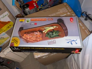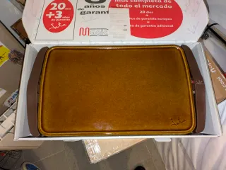 Plancha de cocina Jata con un acabado en cerámica de color marrón. Ideal para preparar tus comidas. Usada solo una vez. - Superficie de cocción amplia. - Asas laterales para un fácil manejo.