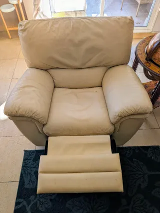 Cómodo sillón reclinable con reposapiés integrado. Es perfecto para relajarse. - Estructura robusta tapizado con polipiel beige. - Reposapies desplegable. Por sí sólo 40 o con el sofá de 3 plazas del mismo tipo, lo dejo a 100 todo.