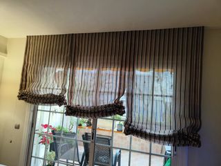 Cortina estilo estor con un diseño de rayas verticales. - Diseño de rayas en tonos beige y marrón. - Mecanismo de cuerda para ajustar la altura. Deja pasar la luz. Medidas: 2,70 ancho x 2,49 alto