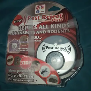 Dispositivo electrónico para ahuyentar roedores. - Modelo: Pest Reject PRO. - Diseño circular plateado. - Indicadores LED en la parte inferior. Ahuyentador de ratas, roedores e insectos con tecnología electromagnética y ultrasonidos. Marca Pest Reject Pro Nuevo, con la caja de embalaje deteriorada. A46