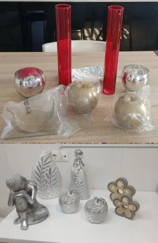 Conjunto de elementos decorativos para el hogar. - Dos jarrones altos de cristal rojo Ikea. ( Hecho a mano) - Dos manzanas doradas decorativas, una de ellas en su embalaje original. - Una figura decorativa de una persona meditando, plateada. - Una figura decorativa en forma de hoja dorada. * CONJUNTO PLATEADO: - Figura decorativa de persona estilizada, plateada. - Jarrón decorativo plateado. - Dos pequeñas cajas decorativas en forma de manzana, plateadas. Regalo los cuencos plateados y objeto decorativo madera. .
