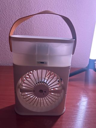 Este ventilador portátil combina funcionalidad y diseño. - Conexión USB-C para mayor compatibilidad. - Función humidificador integrada. - Diseño moderno en tonos beige y blanco.