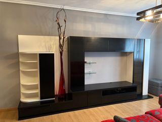 Mueble de salón con un diseño moderno y elegante, combinando acabados. - Estructura principal en color negro. - Paneles y estantes en color blanco. - Superficies de cristal. - Fabricado en madera. Se vende el mueble desmontado.