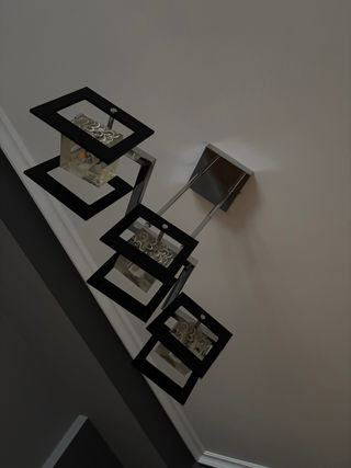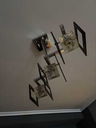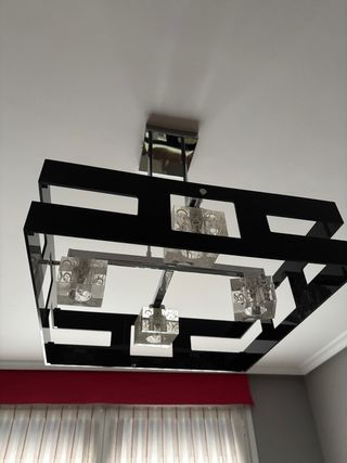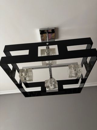 Elegante lámpara de techo con un diseño contemporáneo. - Estructura metálica con acabado plateado. - Detalles en cristal con un patrón decorativo. - Marcos cuadrados en color negro.