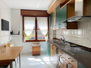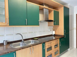 Cocina equipada en buen estado, con una combinación de acabados en madera y detalles en verde. - Encimera de mármol. - Frontales de armarios en madera y verde. - Electrodomésticos integrados. Excepcion de lavadora - Fregadero doble de acero inoxidable. - Vitrocerámica. - Campana extractora metálica. Incluye dos modulos. Modulo de encimera y otro modulo con horno, microondas y mas muebles. Las medidas que se indican en el anuncio son del modulo de la encimera. Medidas del modulo frontal: Ancho 159,5 cms Alto 234,5 cms lado mas alto y 165 lado mas bajo