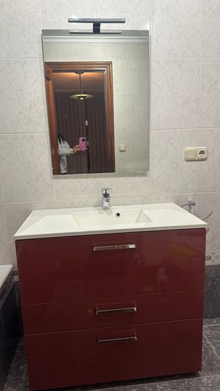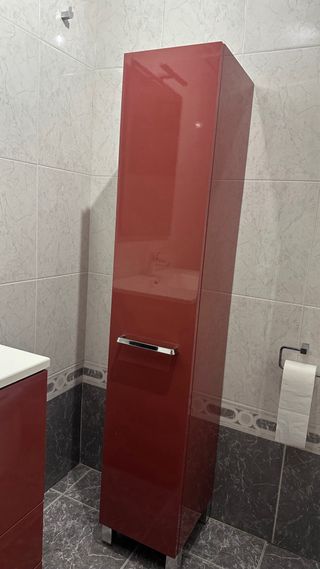 Mueble de baño con un diseño moderno y funcional. Se encuentra en buen estado. Incluye espejo - Acabado en color rojo intenso. - Tres cajones amplios para almacenamiento. - Tiradores metálicos. - Estructura de madera resistente. Medidas de columna de almacenaje 30 ancho x 164,5 alto