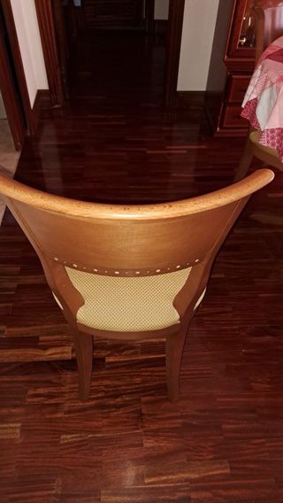 Conjunto de mesa y 4 sillas de salón comedor. De madera maciza, con uso pero en muy buen estado. La mesa tiene unas dimensiones de 140x90cm y es extensible.