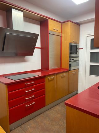 Conjunto de cocina con acabados en madera y detalles en rojo. - Muebles de cocina con puertas de madera y frentes rojos. - Encimera roja. - Armarios superiores con puertas de cristal y frentes rojos. El comprador se encarga del desmontaje y transporte.
