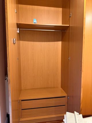 DESMONTADO Gran armario de madera con cuatro puertas. Cuenta con una balda superior y barras para colgar. - Dos cajones inferiores. - Diseño de madera clara. Transporte a cuenta del comprador.