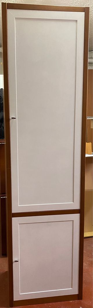 Armario de madera con un diseño moderno y elegante. - Acabado exterior en color marrón y puertas blancas - Interior con baldas y colgador extraible - Construcción robusta en madera.