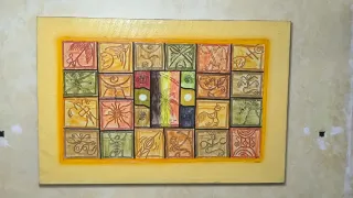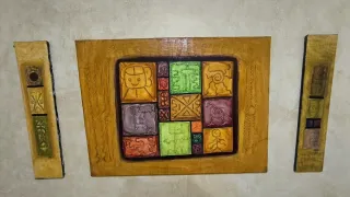 Decoración de pared con diseño inspirado en el arte taíno. Presenta un patrón de recuadros con símbolos y figuras. - Cada recuadro tiene un diseño y coloración únicos. Medidas: (Foto de cuadro central y 2 cuadros pequeños) 2 Pequeños: 16 x 74cm (25€ cada uno) Central: 100 x 74cm (40€) (Foto cuadro grande) 100 x 150cm (60€). Si compras todos te los dejo por 110€ Se pueden enviar pero tendría que desmontarlos y enviarlos enrollados por lo que prefiero que la venta sea en mano.