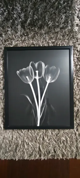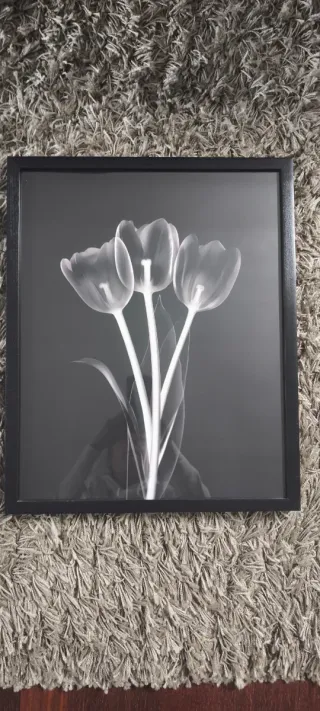 Precioso cuadro decorativo con un diseño de tulipanes en contraste. - Marco negro. - Imagen de tulipanes en blanco y negro.