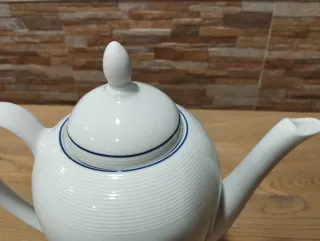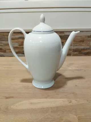 Elegante jarra de porcelana con un diseño clásico y detalles finos. - Acabado blanco brillante. - Asa ergonómica para un agarre cómodo. - Diseño con finas líneas decorativas en color azul