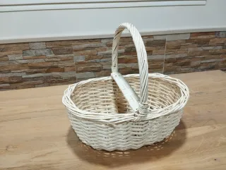 Cesta de mimbre blanca con un diseño clásico y un asa para facilitar su transporte. Es un accesorio versátil para el hogar.