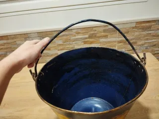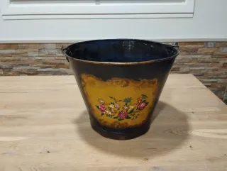 Maceta grande metálica con un diseño floral pintado a mano. Su forma cónica y sus asas le dan un toque rústico. - Acabado exterior azul oscuro con detalles dorados. - Panel frontal con un diseño de flores y hojas en tonos amarillos, rosas y verdes. - Asas metálicas en los laterales.