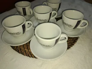 Conjunto de seis tazas de café de la marca Fortaleza. Ideales para disfrutar de un buen café. A estrenar. - Fabricadas en cerámica y porcelana. - Diseño elegante en blanco con detalles en negro.
