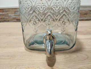 Dispensador de bebidas de cristal con un diseño elegante y un grifo metálico. - Capacidad 5L. - Tapa de metal para un cierre seguro. - Decoración en relieve en el cristal.