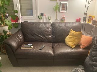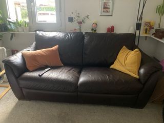 Sofá de dos plazas con un diseño elegante y confortable. Ideal para cualquier sala de estar. - Tapicería de cuero. - Color marrón oscuro.