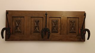 Este perchero rústico aporta un toque de encanto a cualquier espacio. Presenta un diseño de madera con detalles tallados. - Diseño con herrajes de metal. - Acabado en madera oscura. - Detalles en color rojo.