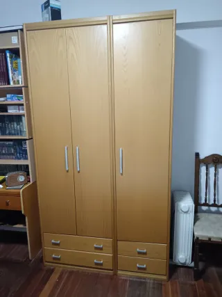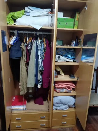 Armario de madera con tres puertas y cajones inferiores. Su diseño clásico se adapta a cualquier habitación. - Tres puertas principales. - Cajones en la parte inferior para almacenamiento adicional. - Tiradores de madera.