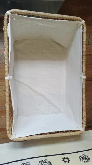 Cesto de gran tamaño, perfecto para organizar y almacenar diversos objetos en casa. Su diseño combina la resistencia del mimbre con la suavidad de un forro interior. - Material exterior de mimbre tejido. - Forro interior de tela blanca. 40x60x29