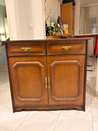Conjunto de muebles de salón en buen estado. - Diseño clásico y elegante. - Acabado en madera natural. - Tiradores dorados. - Puertas y cajones. 1 mueble almacenaje de estilo 1 juego mueble de almacenamiento y espejo 1 mueble de almacenamiento con puertas y cajones 1 mueble de almacenamiento con vitrina y cajones 1 mesa redonda 4 sillas