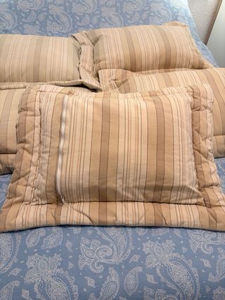 Conjunto de cinco cojines decorativos con un diseño de rayas verticales. - Color principal beige con detalles en la gama del marrón. - Tejido suave al tacto.