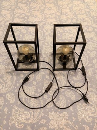 Set de dos lámparas de diseño moderno con estructura cúbica. - Base y estructura metálica negra. - Pantalla esférica de cristal transparente. - Incluye cable con interruptor.