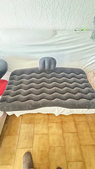 Colchón hinchable diseñado para adaptarse al asiento trasero de un coche. Su forma ondulada proporciona comodidad. - Diseño con reposacabezas integrado. - Acabado aterciopelado.