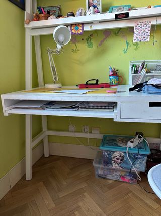 Escritorio de madera con un diseño moderno y funcional. Cuenta con estantes superiores y un cajón. - Estructura de madera. - Acabado en blanco. - Incluye estantes. - Dispone de un cajón. Hay que pintarle ya que tiene signos de uso. Le vendo por que es demasiado grande