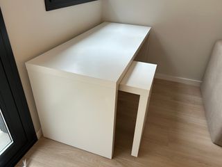 Escritorio de madera de Ikea en color blanco. Cuenta con un diseño funcional y práctico. - Amplia superficie de trabajo. - Compartimentos de almacenamiento integrados.