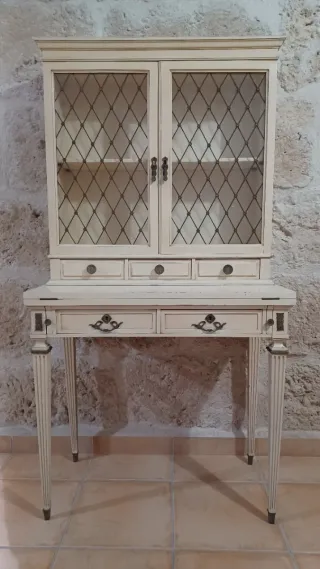 Elegante secreter con vitrina superior. Un mueble clásico con un toque de distinción. - Acabado en color crema. - Puertas de cristal con reja decorativa. - Cajones con tiradores ornamentados. Patas torneadas con detalles de metal. Mueble muy versátil, ya que puede ser un escritorio con almacenaje, un pequeño aparador con vitrina, etc