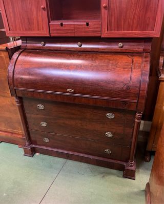 Se vende escrirorio antiguo de cilindro estilo Luis XVI.Bureau antiguo.Elegante escritorio antiguo con tapa de cilindro enrollable. Presenta un diseño clásico y funcional. - Múltiples cajones para organización. - Detalles ornamentales en la parte superior. - Patas estilizadas.