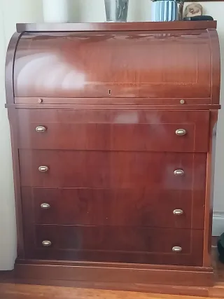 Elegante escritorio tipo bureau fabricado en madera maciza. - Diseño clásico con persiana enrollable. - Cajones con tiradores. - Llave incluida para el cierre.