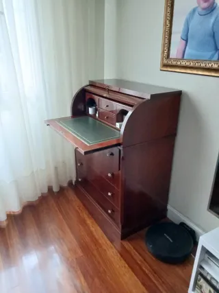 Elegante bureaude madera con un diseño clásico y funcional. - Tapa enrollable para ocultar el área de trabajo. - Tres cajones con tiradores metálicos. - Acabado pulido y detallado.