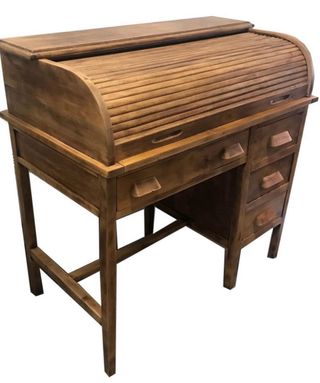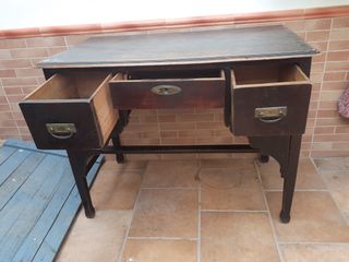 Escritorio con persiana en madera de teka de estilo colonial y silla a juego con asiento de cuero. En perfectas condiciones. Tiene 2 cajones grandes en la mesa y en la parte de arriba otros 2 más y 3 mas pequeños. La silla tiene el asiento en cuero y es plegable. El conjunto son 345€Por separado , el escritorio 285€ y la silla 60€