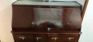 antiguo, madera maciza. Estilo inglés. Escritorio buró con tapa, 2 cajones y armario con una balda y 2 puertas. Lleva una vitrina con 2 estantes, 2 puertas y copete en lo alto. Mide 110x40x210cms de altura. Se puede ver en barrio de Moratalaz. Puedo llevar a domicilio. WhatsApp 636080612.
